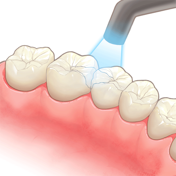 硬化したレジンの表面を整形し、自然な歯の形状に仕上げます。 最後に、磨いて光沢を出します。