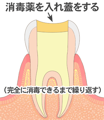 特殊な洗浄液を使用して、根管内の残りの細菌や歯髄組織を取り除きます。 -
