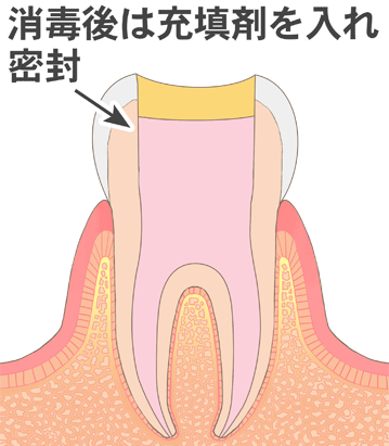 根管内の清掃が完了したら根管充填材で埋め、感染の再発を防止します。